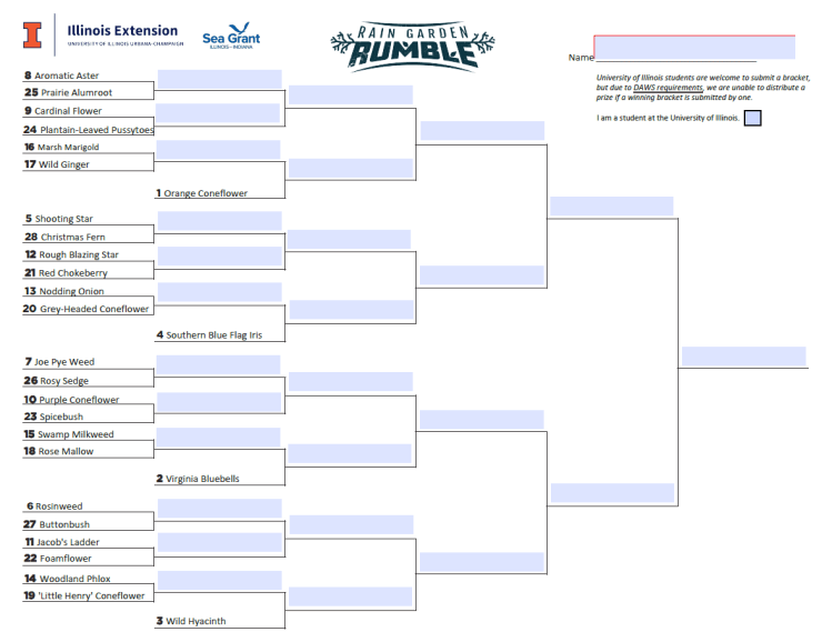 - Submit your completed bracket to RedOakRainGarden@illinois.edu by Monday, March 17. Matches begin the following day.