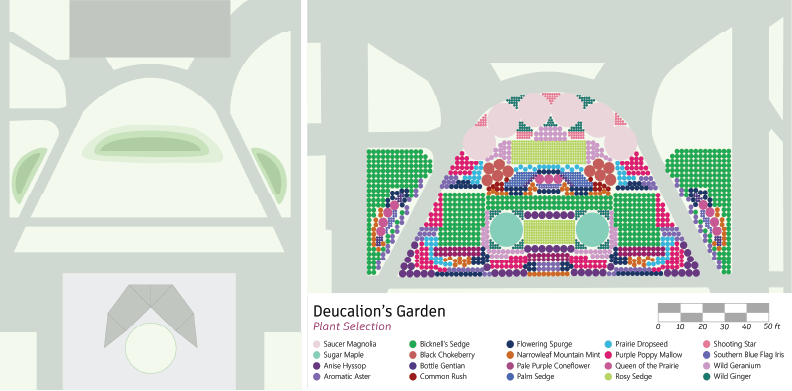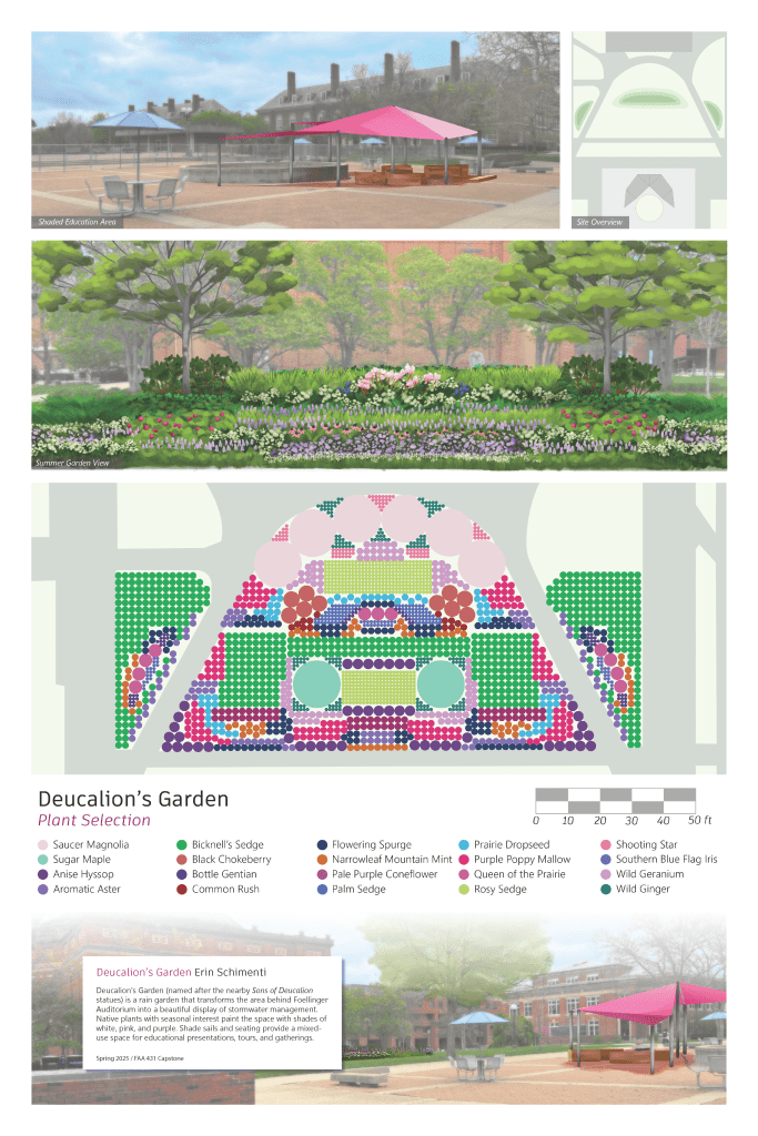 During my time as a student working with the Red Oak Rain Garden (RORG), I learned how green stormwater infrastructure (GSI) can transform spaces into thriving native ecosystems that also serve their communities. So when it came time to choose a topic for my senior capstone project, designing a rain garden felt like the natural choice. That’s how the first seeds of Deucalion’s Garden, a hypothetical rain garden and educational space south of Foellinger Auditorium, were sown.