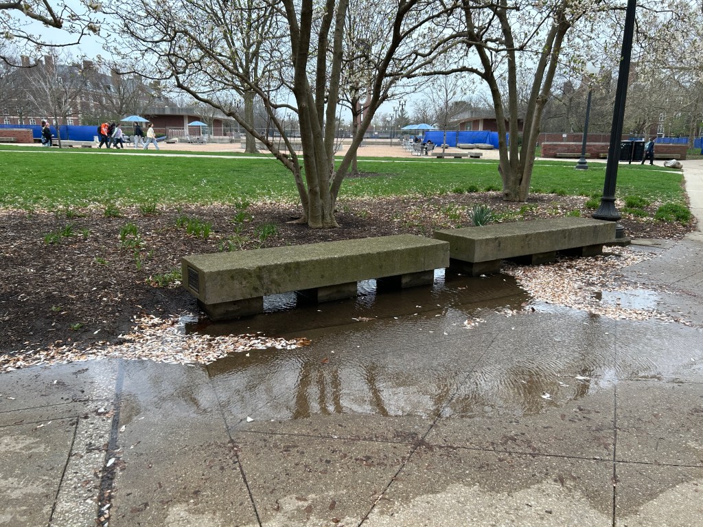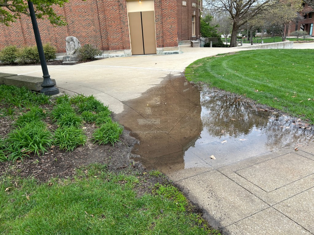 My work on this project started last fall in my capstone seminar course, where I laid the groundwork through research and planning, which would become instrumental to my work in the spring. The first step was identifying the site location. I chose the area between the Main Library and Foellinger Auditorium, which currently has a few scattered plants and trees but is mostly turf grass. An active part of campus right by the main quad, students and faculty regularly pass through. However, I noticed after rainfalls that the sidewalks frequently flood, causing many people to avoid the area.