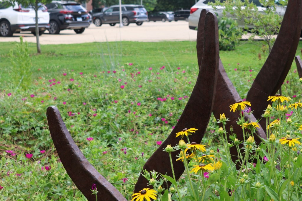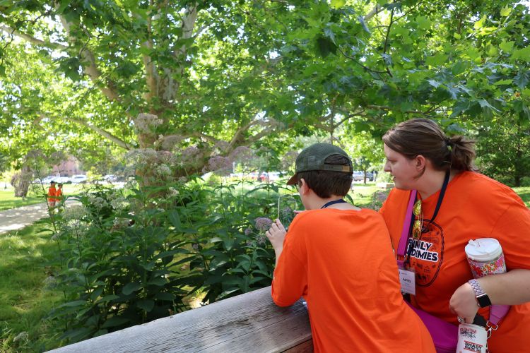 In July, I had the chance to bring a DSLR camera along during volunteer workdays and university tours of the rain garden, which let me capture some of its magic. In the height of summer, the garden was a mosaic of color. The photos I took pictured volunteers and visitors alike, enjoying the vibrant green space, with blooms like orange coneflower and purple poppy mallow buzzing with bees and butterflies.