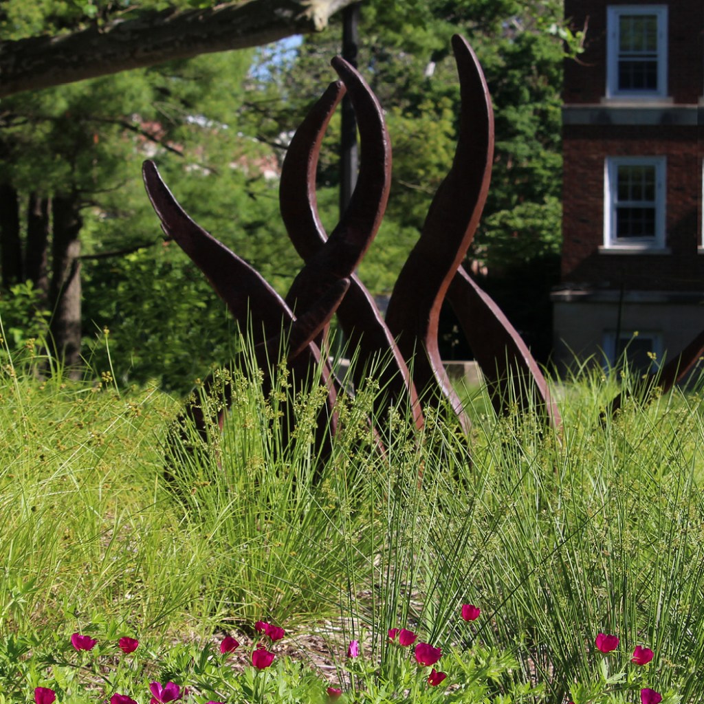 The Prairie Fire sculpture, installed during the original Red Oak Rain Garden construction in 2006, was designed by Jennifer Astwood, when she was a graduate student in Fine and Applied Arts. Made of Core 10 steel, the sculpture represents flames of prairie fires, which were common before European settlement of Illinois. Learn more here.