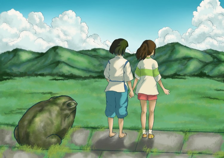 Although it may not be as on-the-nose about environmentalism as other Ghibli films such as Pom Poko and My Neighbor Totoro, Whisper of the Heart offers a more modern reflection on how humans interact with nature in an urban environment. The film demonstrates that even in a modern environment such as Tokyo, humans can still take time to notice and appreciate the living world around them. One key example of this is Shizuku’s deep respect for animals, seen when she follows a strange cat that gets off at the same train stop as her. Instead of ignoring the animal, Shizuku respects him and makes an active effort to talk to the cat as if he were a friend, showing her compassion for the animals that share her surroundings. Furthermore, we can see Shinzuku’s awareness of the tension between the modernization of her home and the destruction of nature used to create it in her parody of “Take Me Home, Country Roads”, entitled “Concrete Roads”. The lyrics, including lines such as “Concrete roads, everywhere I go…” and “Chopped down forests, buried our valleys, my hometown’s down concrete road…” show her recognition of the environmental impact of urbanization in her community. By weaving these subtle environmental messages into the story, Whisper of the Heart leaves viewers more conscious of nature amid city life.